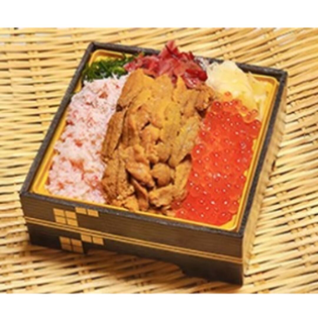 ウニ、紅ズワイガニのほぐし身、いくらを贅沢にのせた彩り鮮やかなお弁当です。