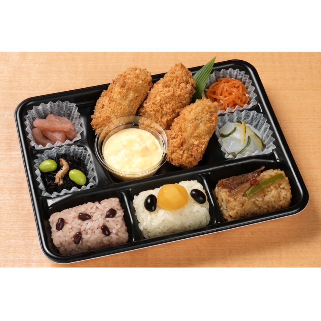 播磨灘産の新鮮牡蠣を使用した期間限定商品。プリっとはじける食感の牡蠣フライと、オリジナルのレモン風味タルタルを一緒に味わえるお弁当。